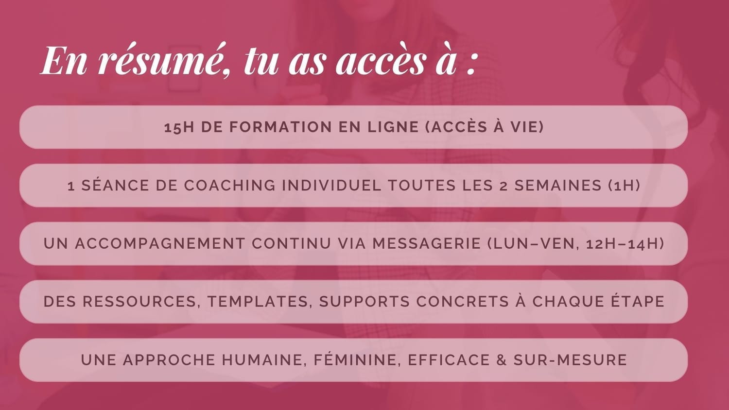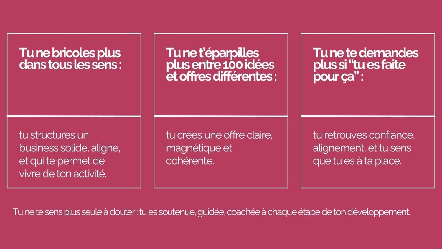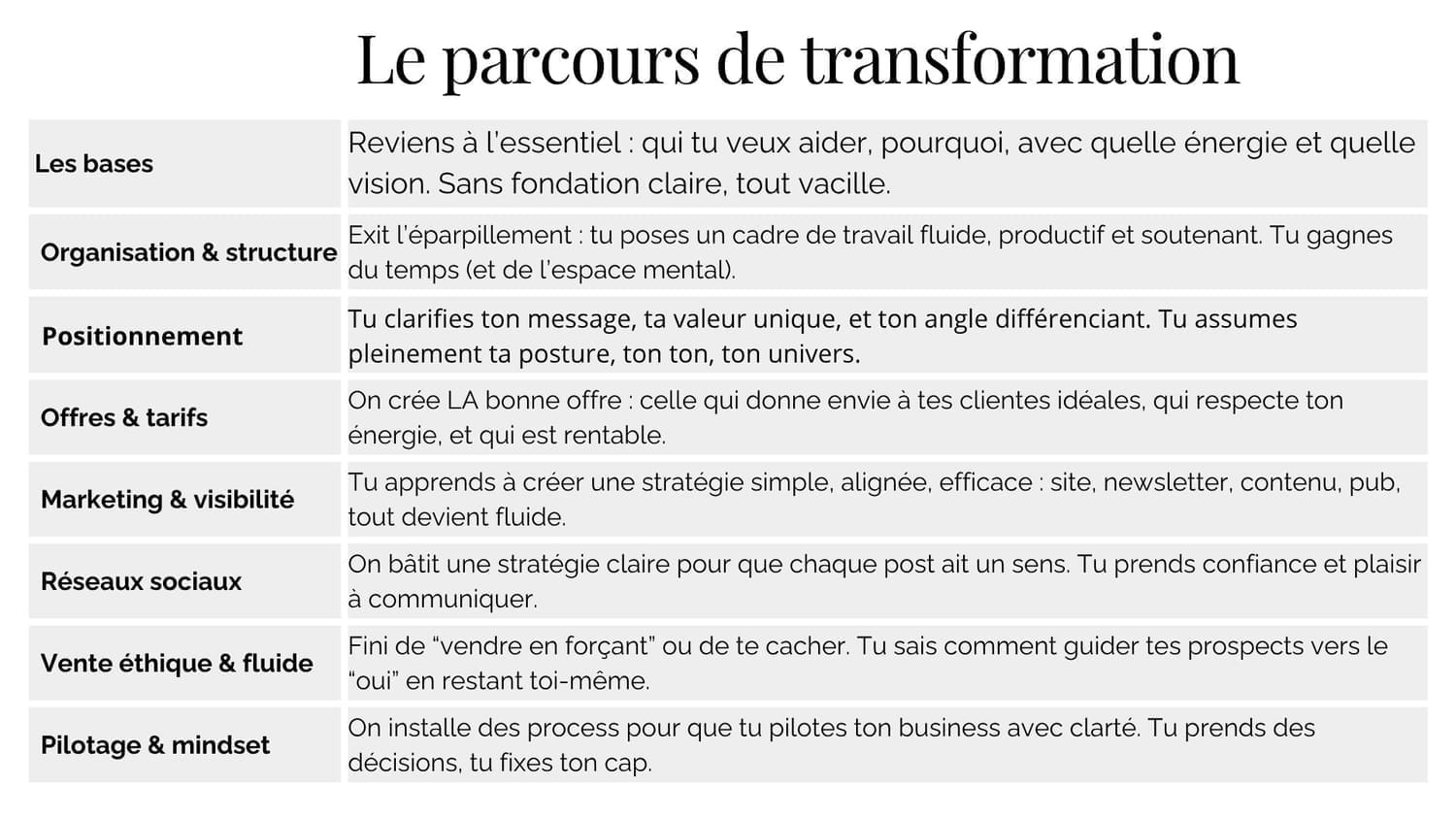 Que tu sois en création, en pivot ou déjà active, le programme s’adapte à ton point de départ. On repart toujours des fondations avant de bâtir la suite.