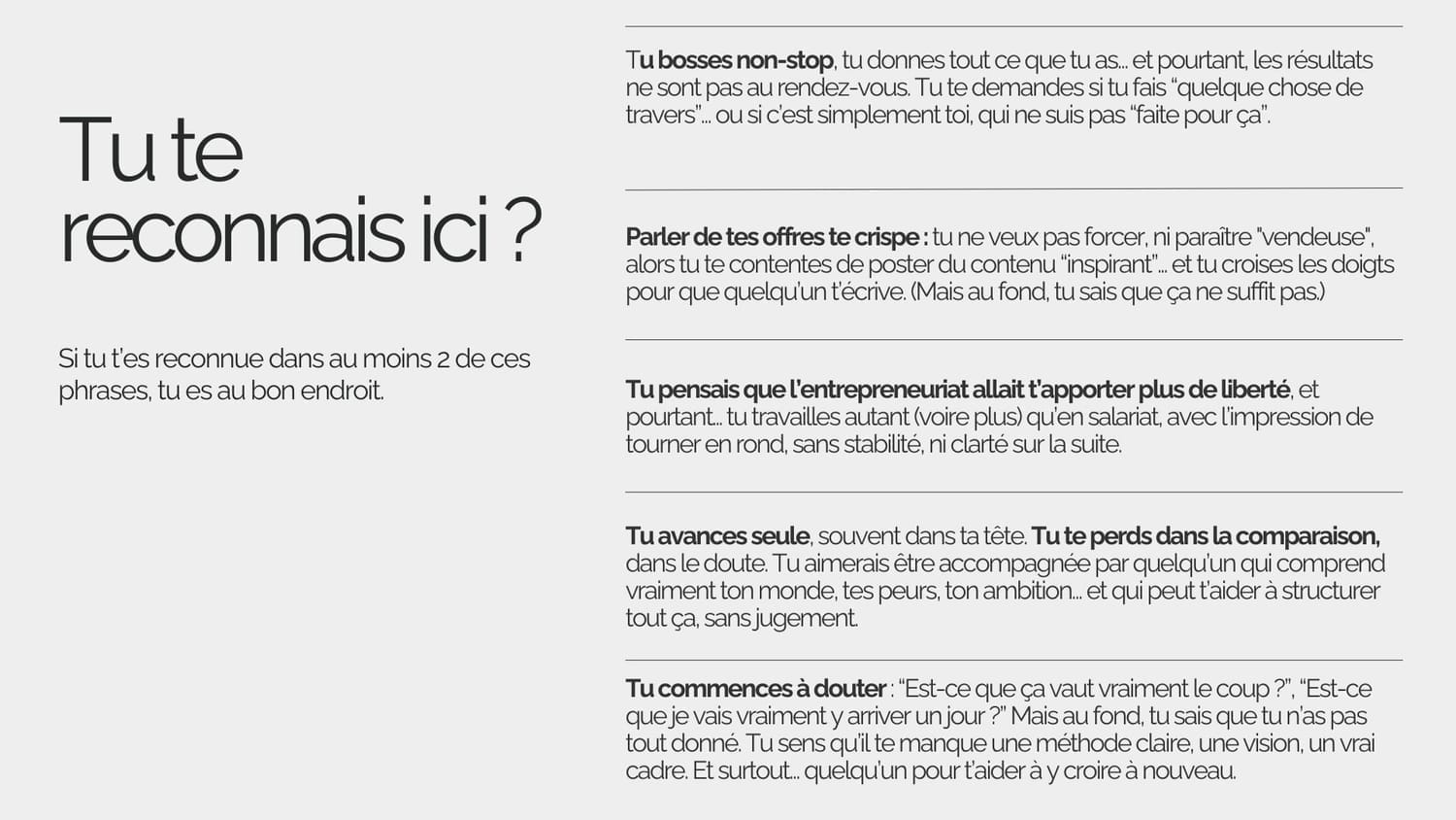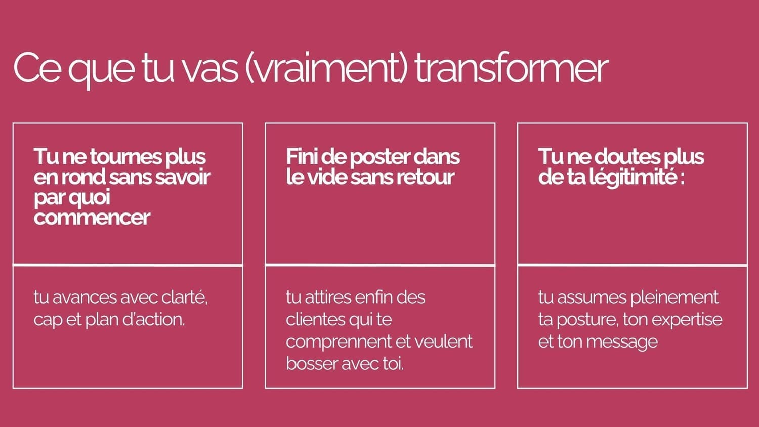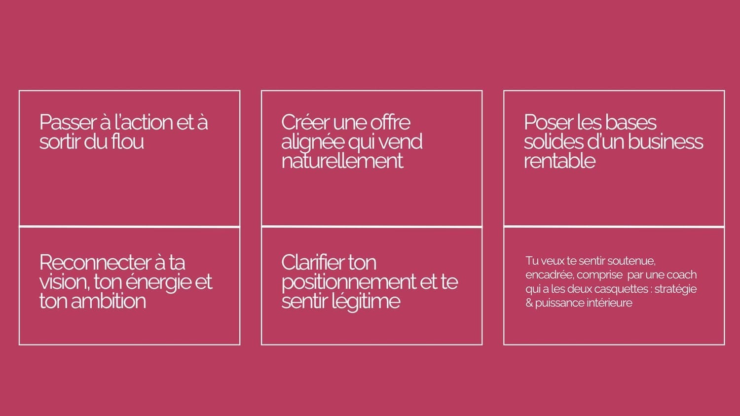 Que tu sois en création, en pivot ou déjà active, le programme s’adapte à ton point de départ. On repart toujours des fondations avant de bâtir la suite.