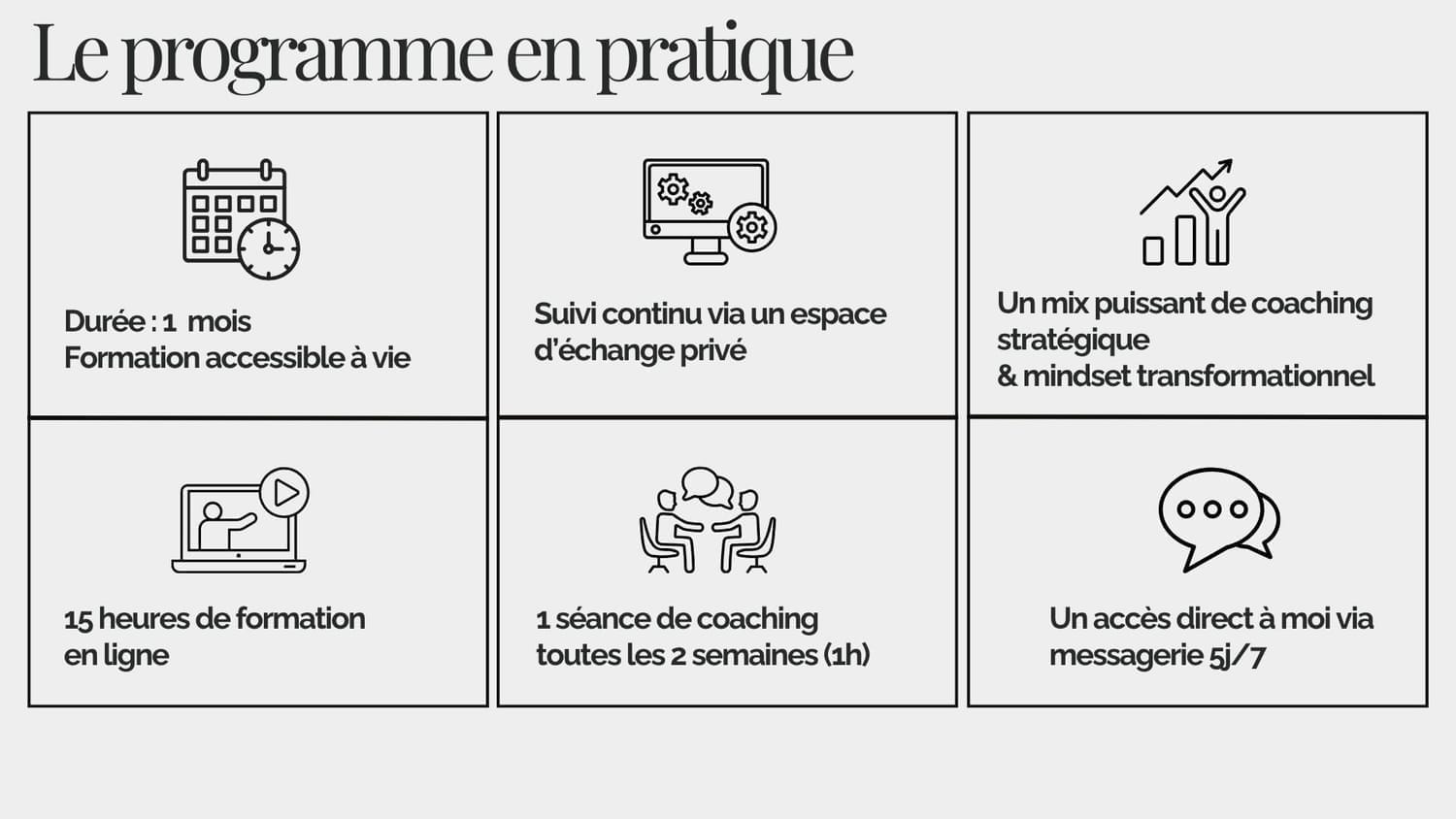 Des séances de coaching individuel planifiables à ton rythme via Calendly (1 séance tous les 15 jours pendant 3 mois).
